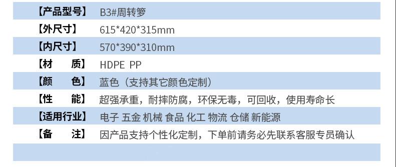本店產品常規庫存為全新料藍色塑料托盤,周轉箱,周轉籮,化工桶,中空板材及部分高性價比黑色一次性出貨產品。如需要其他顏色請聯系客服對接處理。因產品規格較多,未能全部上至店鋪,如店中沒有您需要的規格尺寸也請聯系客服。希望能解決您的問題,我們竭誠為您服務?。?!